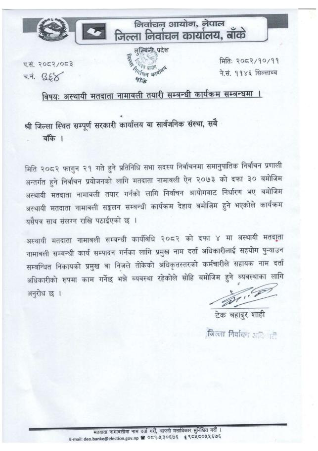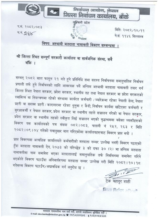 निर्वाचन अधिकृतको कार्यालय,प्रतिनिधि सभा निर्वाचन क्षेत्र नं. ०३ बाँके जिल्लाको प्राप्त पत्र अनुसार राजनितिक दल, नागरिक समाजका व्यक्तित्वहरुलाई सहभागिताका लागि जानकारी गराईन्छ ।