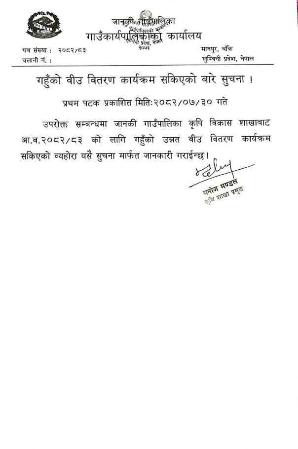गहुँको बीउ वितरण कार्यक्रम सकिएको बारे सुचना.