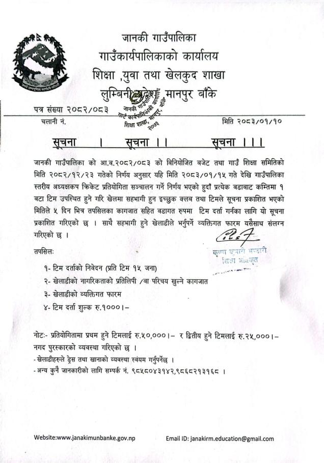 गाउँपालिका स्तरीय अध्यक्षकप क्रिकेट प्रतियोगिता संचालन सम्बन्धी सूचना.