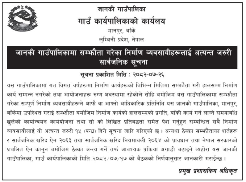 » जानकी गाउँपालिकामा सम्झौता गरेका निर्माण व्यवसायीहरुलाई १५ दिने अत्यन्त जरुरी सार्वजनिक सूचना.