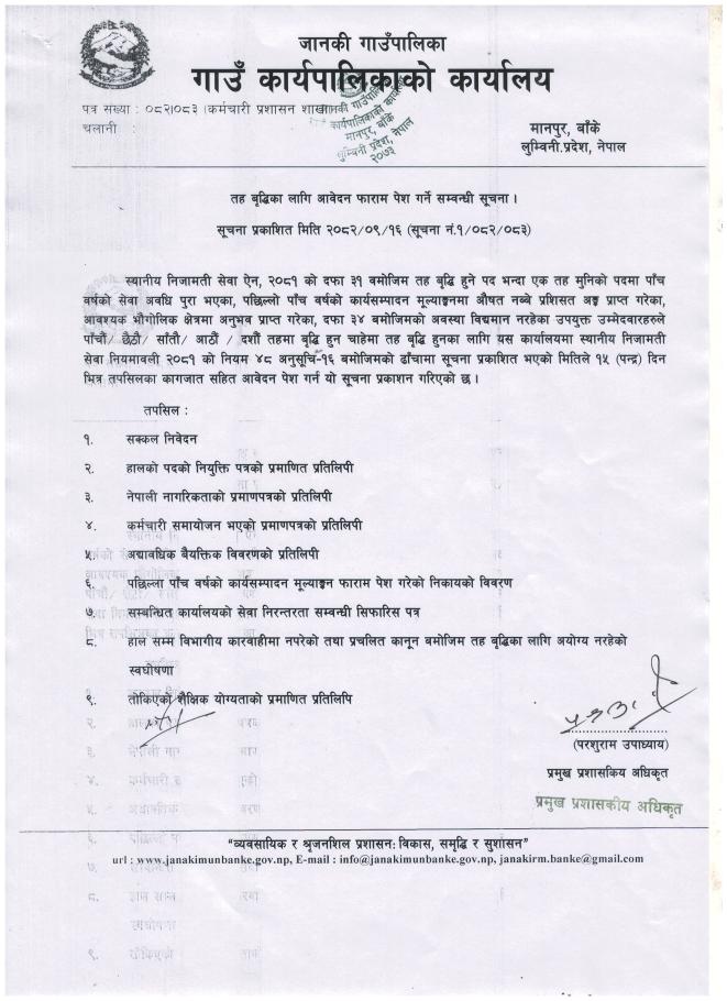 तह वृद्धिका लागि आवेदन फाराम पेश गर्ने सम्बन्धी सूचना.(सूचना प्रकाशित मिति २०८२/०९/१६)