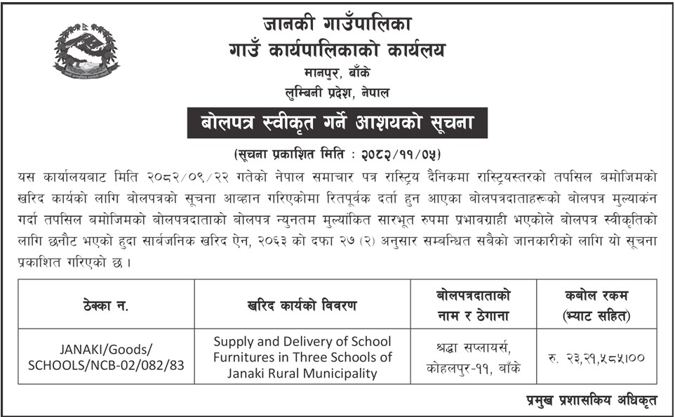 नयाँ पत्रिका राष्ट्रिय दैनिकमा प्रकाशित बोलपत्र स्वीकृत गर्ने आशयको सूचना.(सूचना प्रकाशन मिति: २०८२/११/०५)