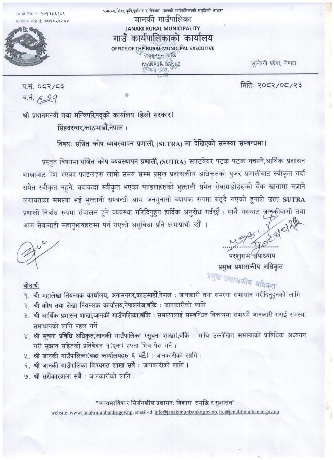 सञ्चित कोष व्यवस्थापन प्रणाली, (SUTRA) मा देखिएको समस्या सम्बन्धमा.