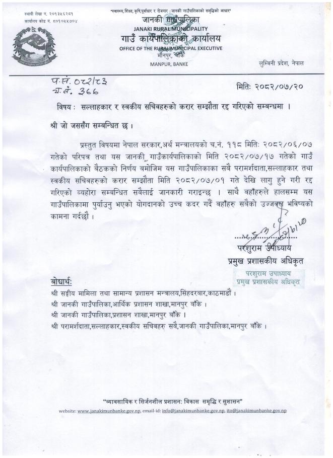 » सल्लाहकार र स्वकीय सचिवहरुको करार सम्झौता रद्द गरिएको सम्बन्धमा.