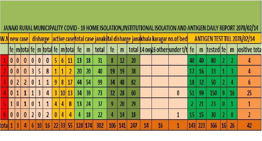 आज मिति २०७८-०२-१४ गते सम्मको जानकी गाउँपालिका अन्तर्गत वडा अनुसारको नयाँ केश,एनटिजेन परिक्षणको रिपोर्ट,सकृय संक्रमीत तथा संस्थागत आइसोलेशनमा रहेका विरामीहरुको विवरण.