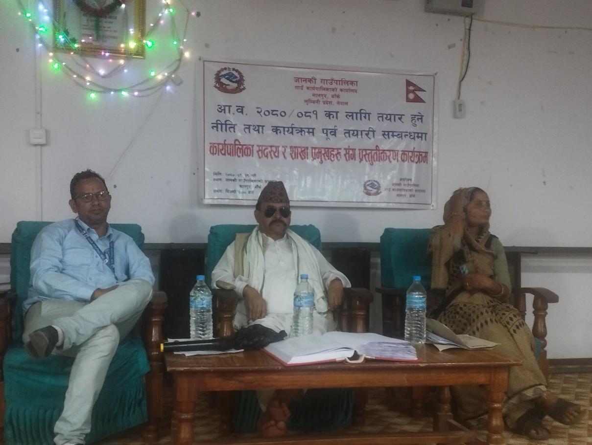आ.व. २०८०/८१ का लागि तयार हुने नीति तथा कार्यक्रम पूर्व तयारी सम्बन्धमा कार्यपालिका सदस्य र शाखा प्रमुखहरु संग प्रस्तुतीकरण कार्यक्रमका केही तस्बिरहरु.