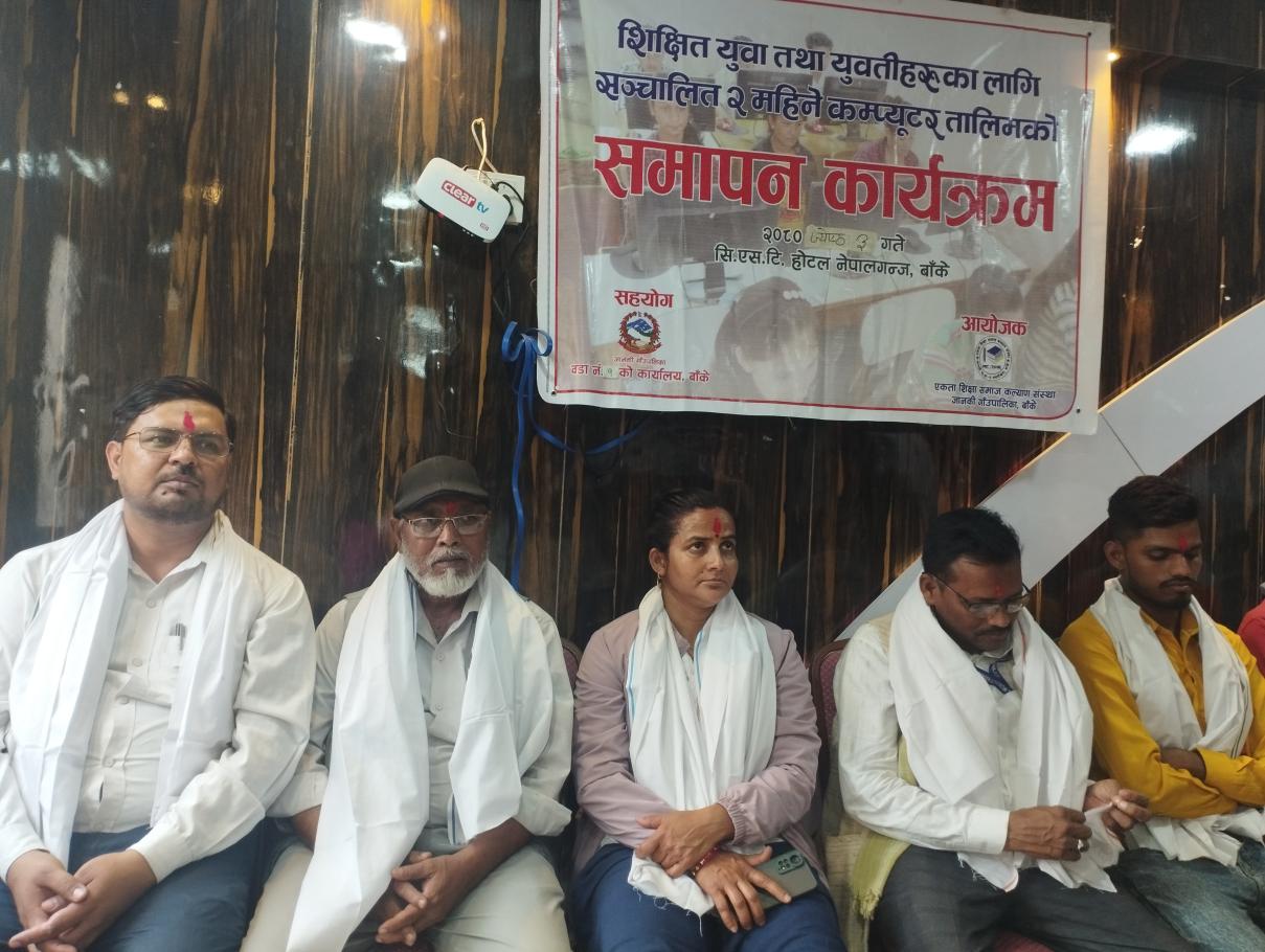 एकता शिक्षा समाज कल्याण संस्था,बाँकेको आयोजना तथा जानकी गाउँपालिका वडा नं. १ को कार्यालय साइगाउँको सहयोगमा वडा नं. १ का शिक्षित युवा तथा युवतीहरुका लागि संचालित २ महिने कम्प्युटर तालिमको समापन कार्यक्रमका केही तस्बिरहरु.