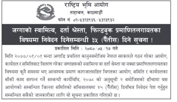 जग्गाको स्वामित्व, दर्ता श्रेस्ता, फिल्डबुक प्रमाणित लगायतका विषयमा निवेदन दिने सम्बन्धी ३५(पैंतीस) दिने सूचना I