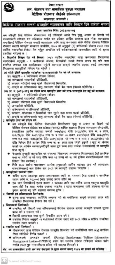 वैदेशिक रोजगार सन्तती छात्रवृत्ति सहायताका लागि निवेदन दिने बारेको सूचना.