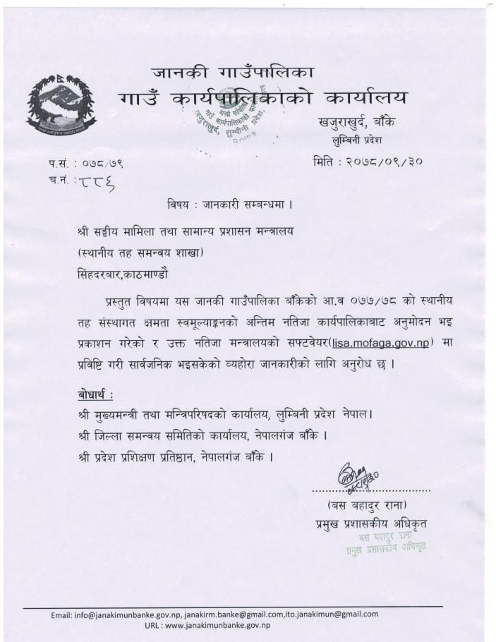 स्थानीय तह संस्थागत क्षमता स्वमूल्याङ्कन(LISA) को अन्तिम नतिजा प्रकाशन सम्बन्धमा.