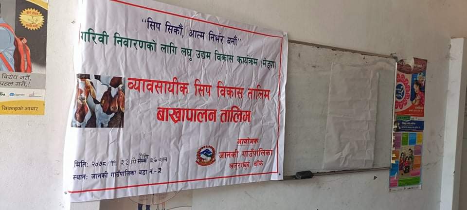 "सिप सिकौ, आत्म निर्भर बनौ" भन्ने मुल नाराका साथ मिति २०७८ फाल्गुन २३ गते जानकी गा.पा अन्तर्गत गरिबी निवारणको लागि लघु उद्यम विकास कार्यक्रम शाखाको आयोजनामा वडा नं. २ बेलभारमा व्यावसायिक सिप विकास तालिम बाख्रापालन तालिमको उद्घाटन कार्यक्रमका तस्बिरहरु.