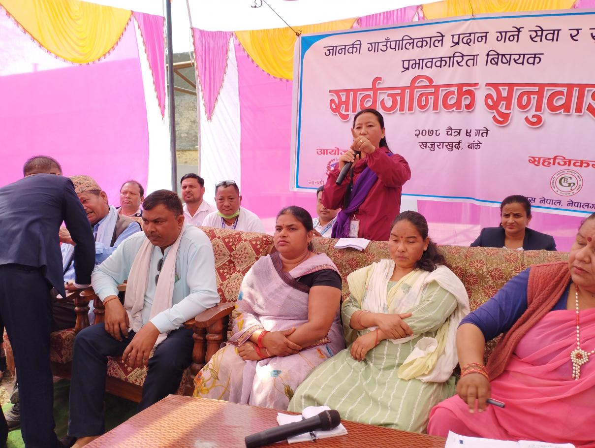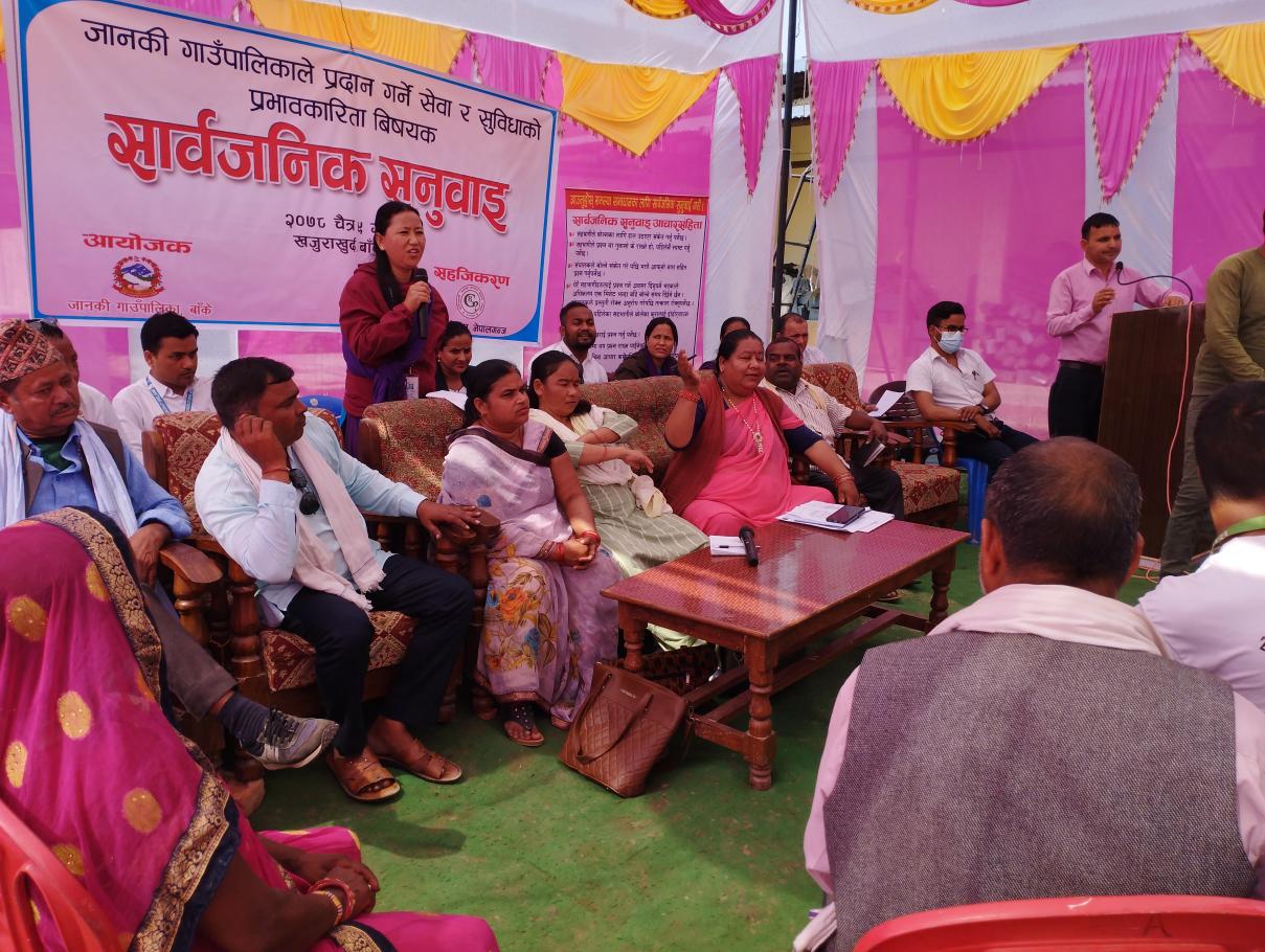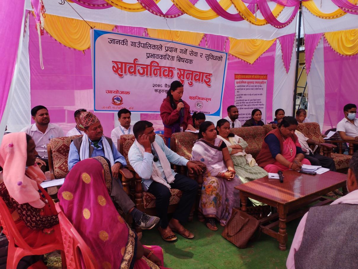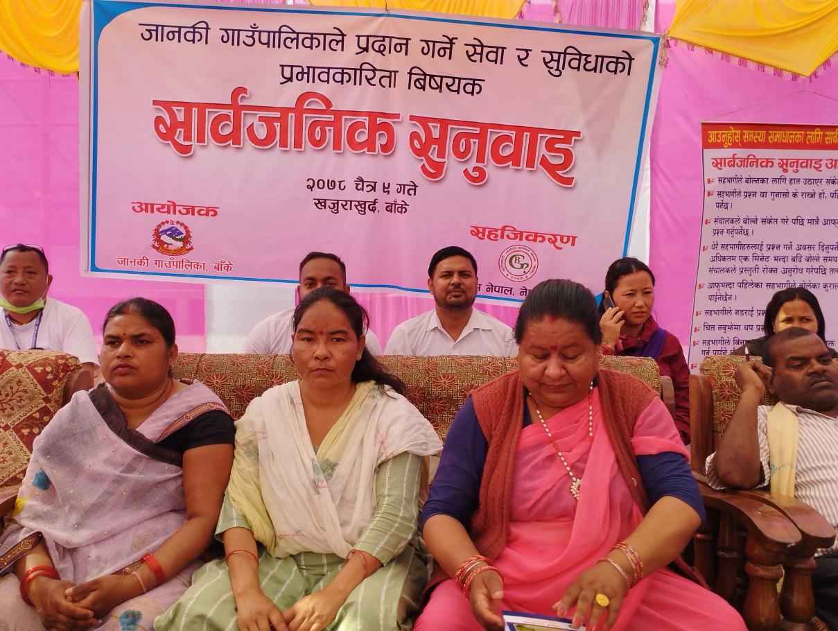 आज मिति २०७८ चैत्र ९ गते जानकी गाउँपालिका,बाँके को आयोजना तथा बास नेपाल,नेपालगन्जको सहजिकरणमा जानकी गा.पा.ले प्रदान गर्ने सेवा र सुविधाको प्रभावकारिता बिषयक सार्वजनिक सुनुवाइका केही तस्बिरहरु.