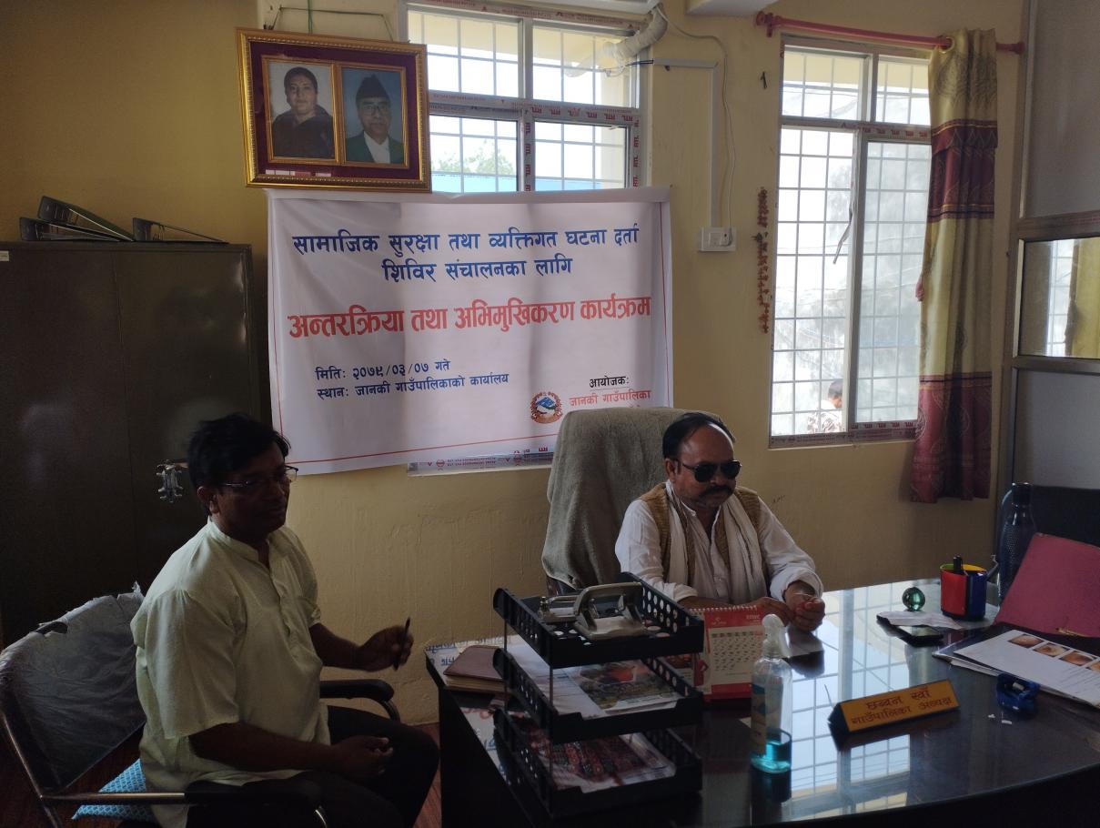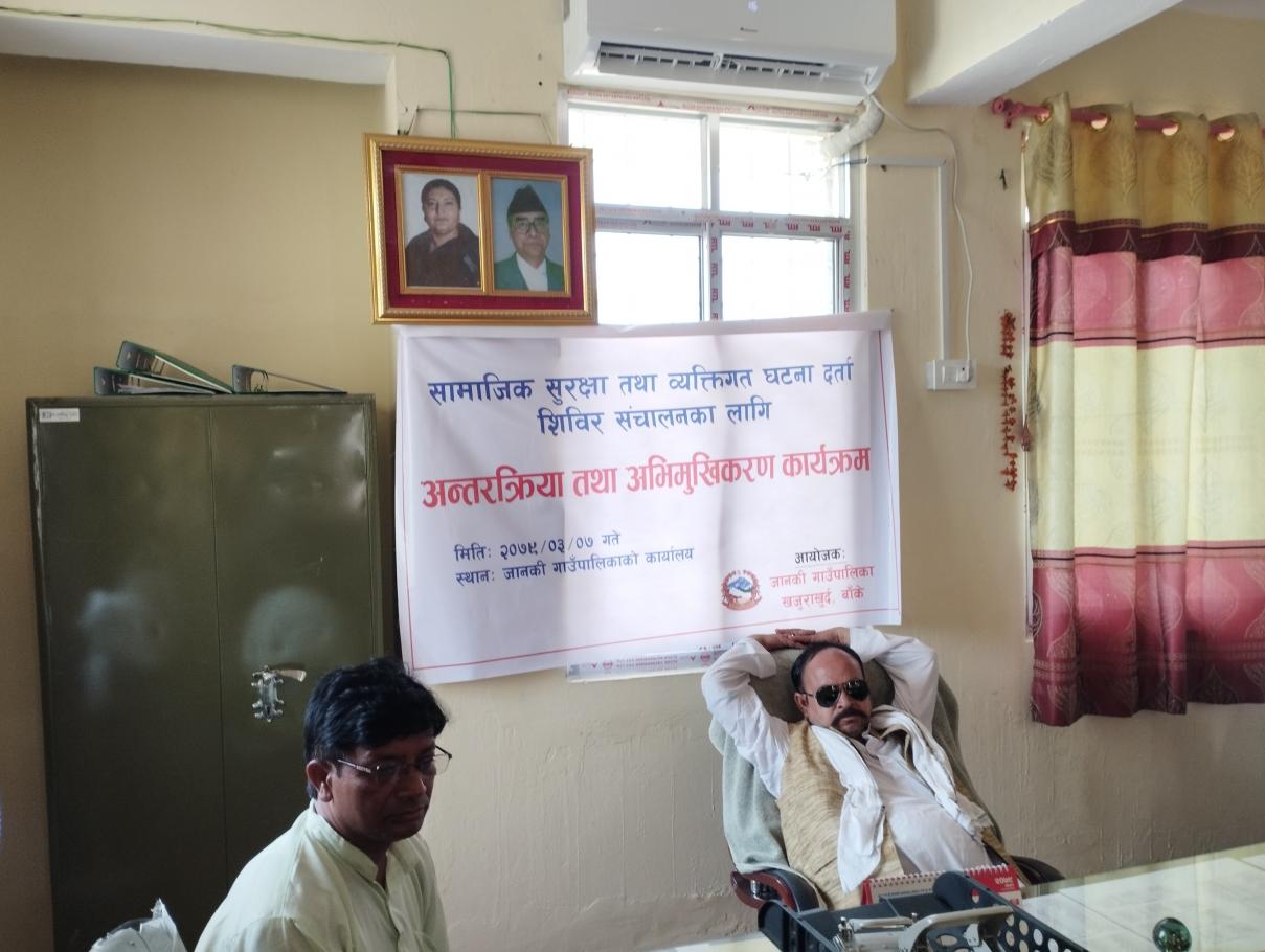 आज मिति २०७९ असार ७ गते जानकी गाउँपालिकाको आयोजनामा सामाजिक सुरक्षा तथा व्यक्तिगत घटना दर्ता शिविर संचालनका लागि अन्तरक्रिया तथा अभिमुखीकरण कार्यक्रमका केही तस्बिरहरु.