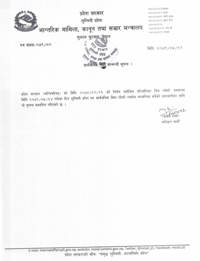 » मिति २०७९/०५/१४ गतेका दिन लुम्बिनी प्रदेश भर हरितालिका तिज पर्वको अवसरमा सार्वजनिक बिदा सम्बन्धी सूचना ।