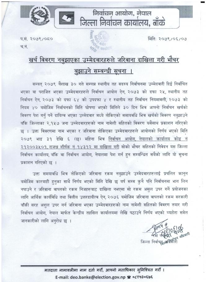 » खर्च विवरण नबुझाएका उम्मेदवारहरुले जरिवाना दाखिला गरी भौचर बुझाउने सम्बन्धी सूचना.