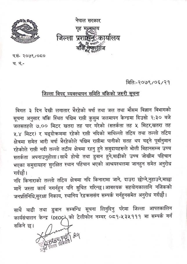 » जिल्ला विपद व्यवस्थापन समिति बाँकेको जरुरी सूचना.