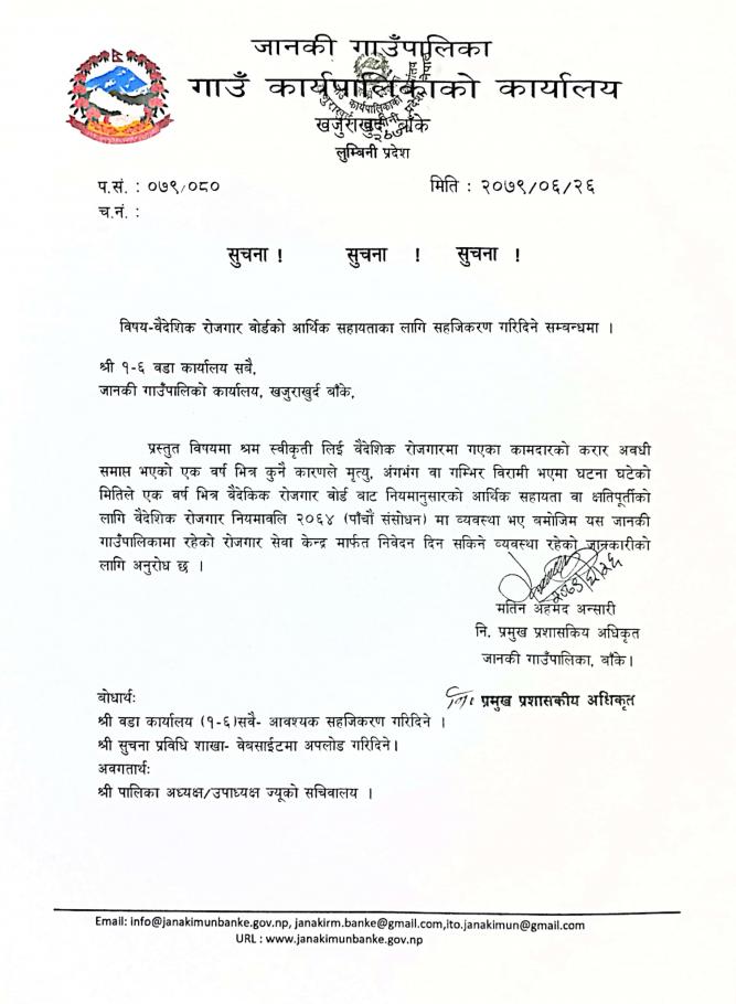 वैदेशिक रोजगार बोर्डको आर्थिक सहायताका लागि सहजीकरण गरिदिने सम्बन्धी सूचना.