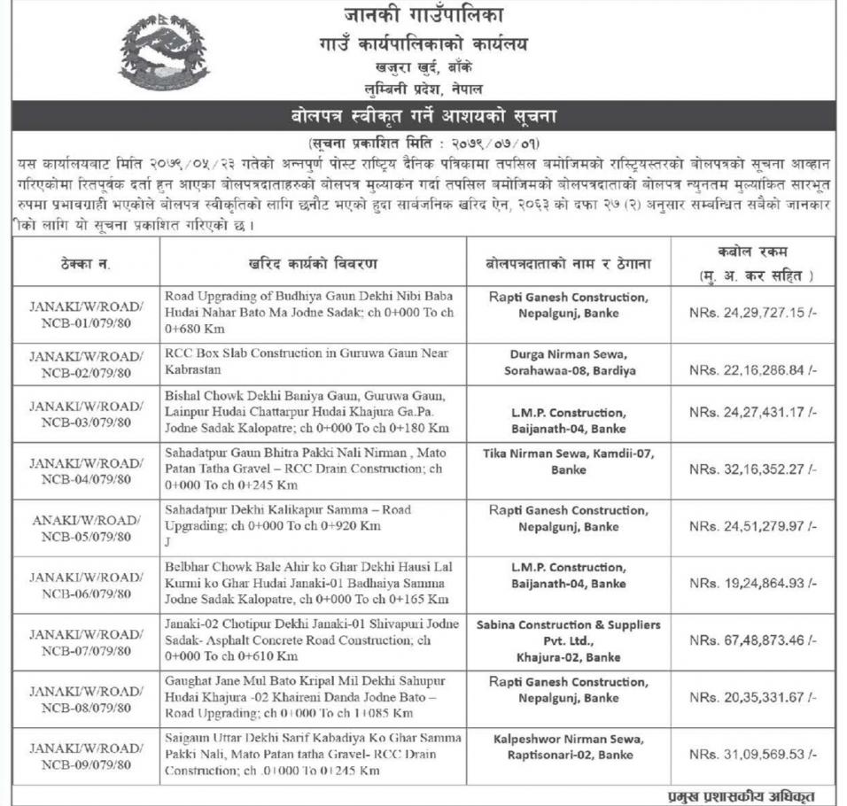 मिति २०७९-०७-०१ गते नयाँ पत्रिका राष्ट्रिय दैनिकमा प्रकाशित बोलपत्र स्वीकृत गर्ने आशयको सूचना.