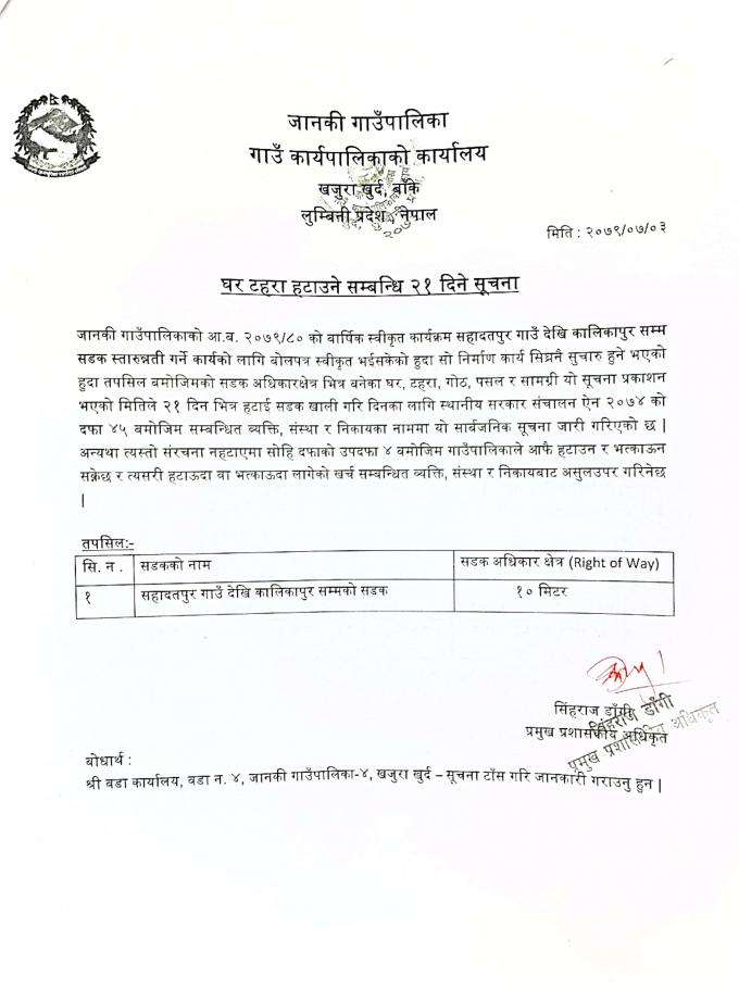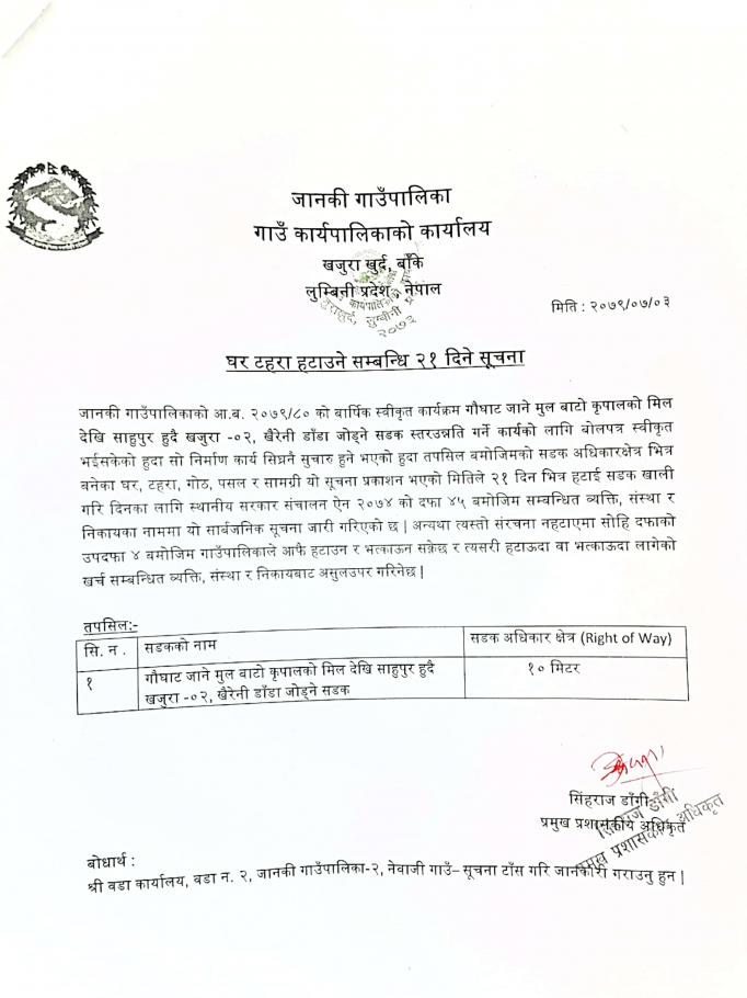 जानकी गाउँपालिका अन्तर्गत वडा नं. १,२,४ र ५ को सम्बन्धित सबैमा जानकारीको लागि अनुरोध छ.