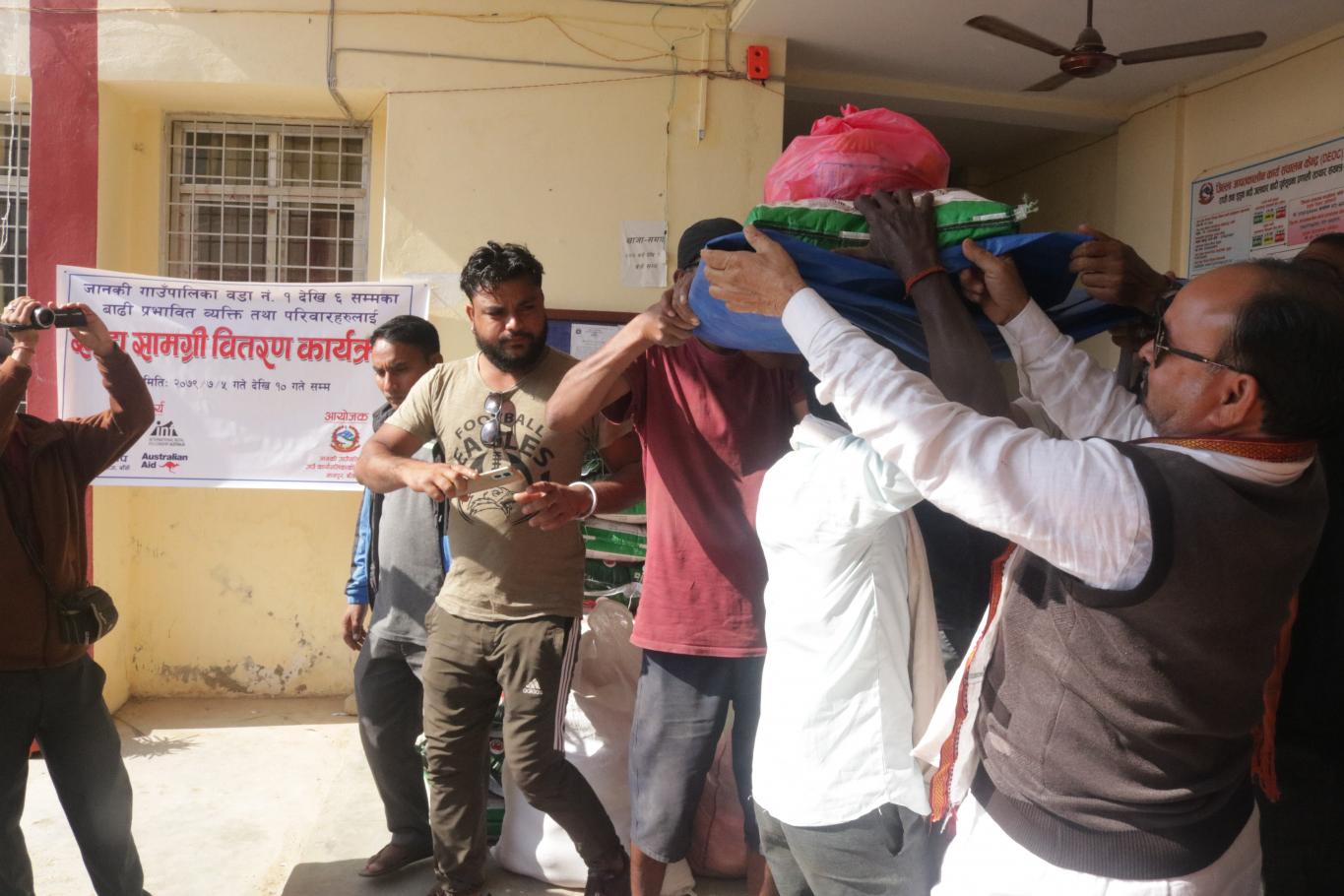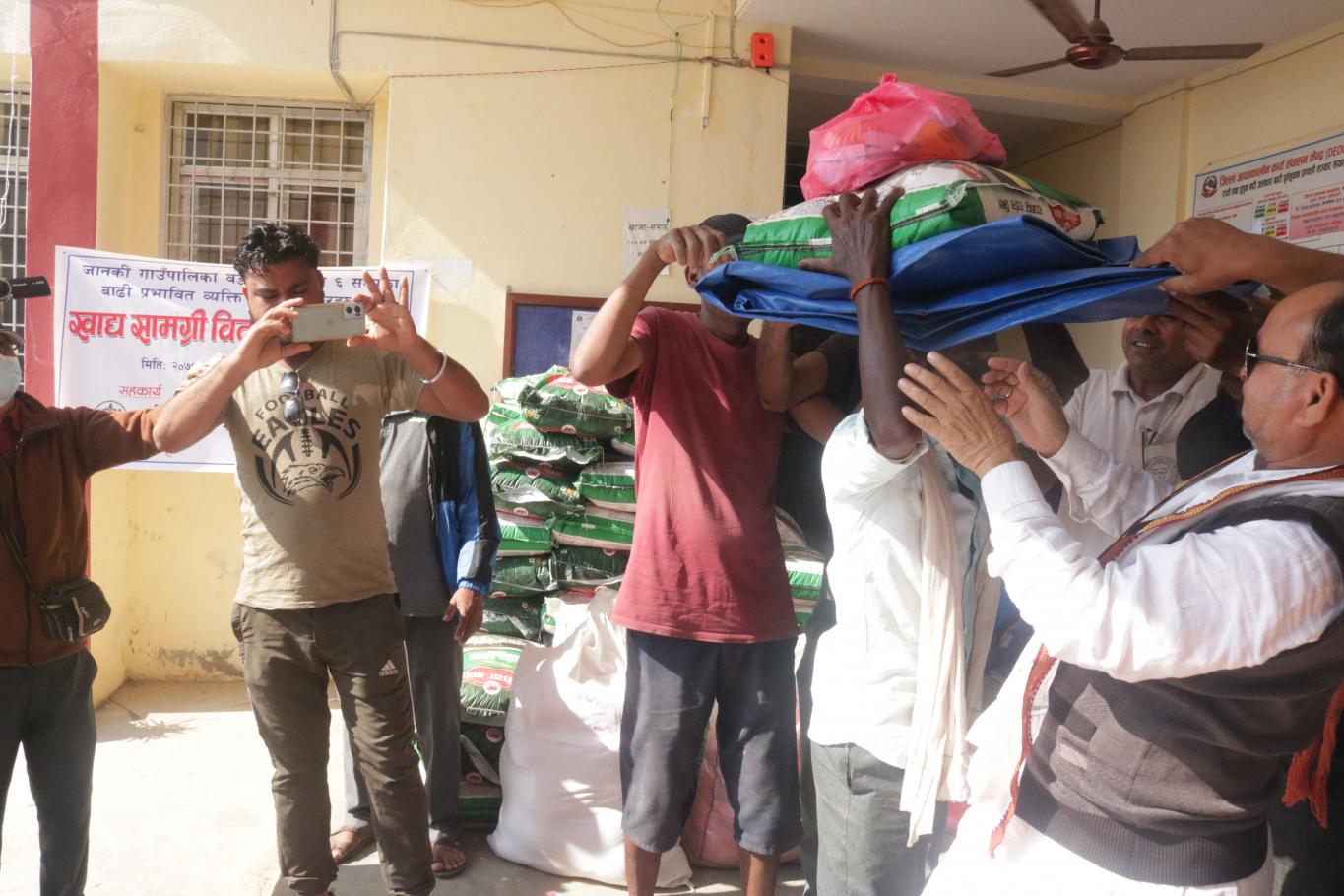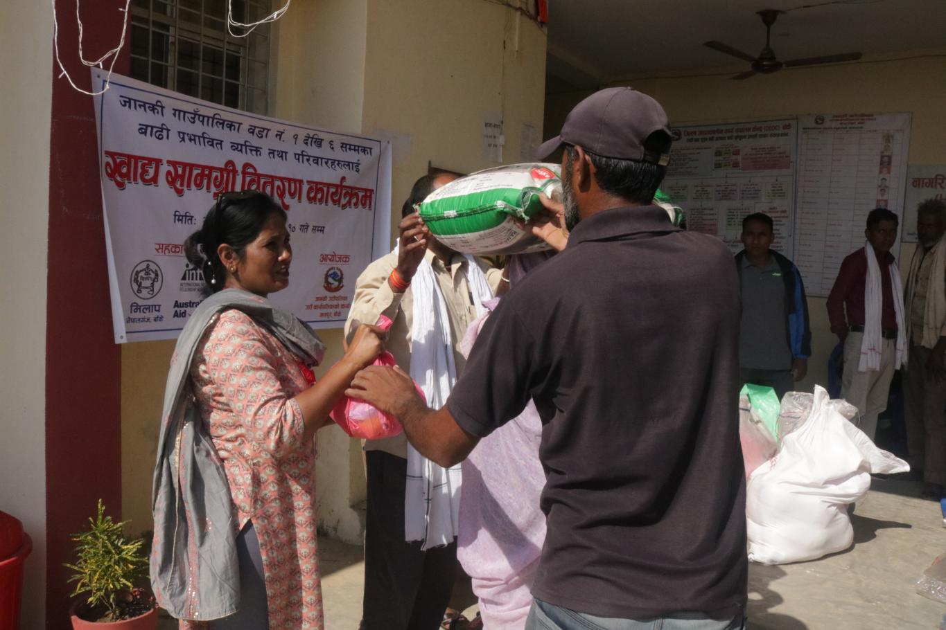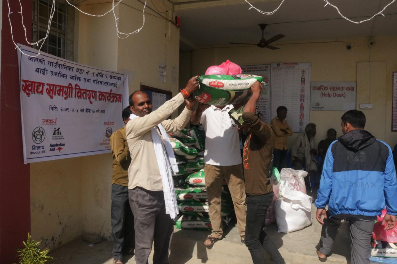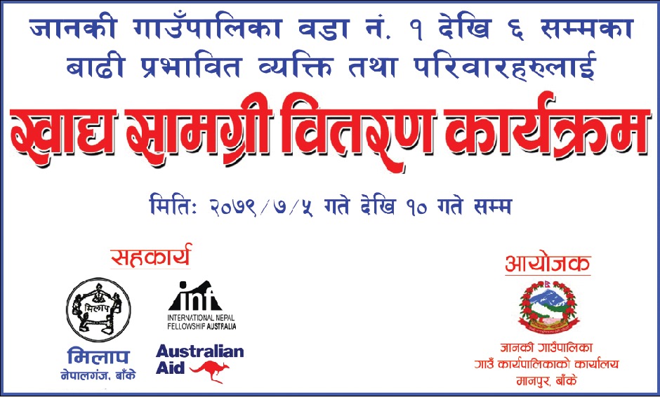 आज मिति २०७९ कार्तिक ५ गते जानकी गाउँपालिका बाँकेको आयोजना तथा मिलाप नेपालगंज बाँके,inf तथा Australian Aid को सहकार्यमा जानकी गाउँपालिका अन्तर्गत वडा नं. १ र २ को बाढी प्रभावित व्यक्ति तथा परिवारहरुलाई खाद्य सामग्री वितरण कार्यक्रमका केही तस्विरहरु.