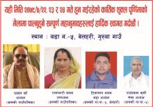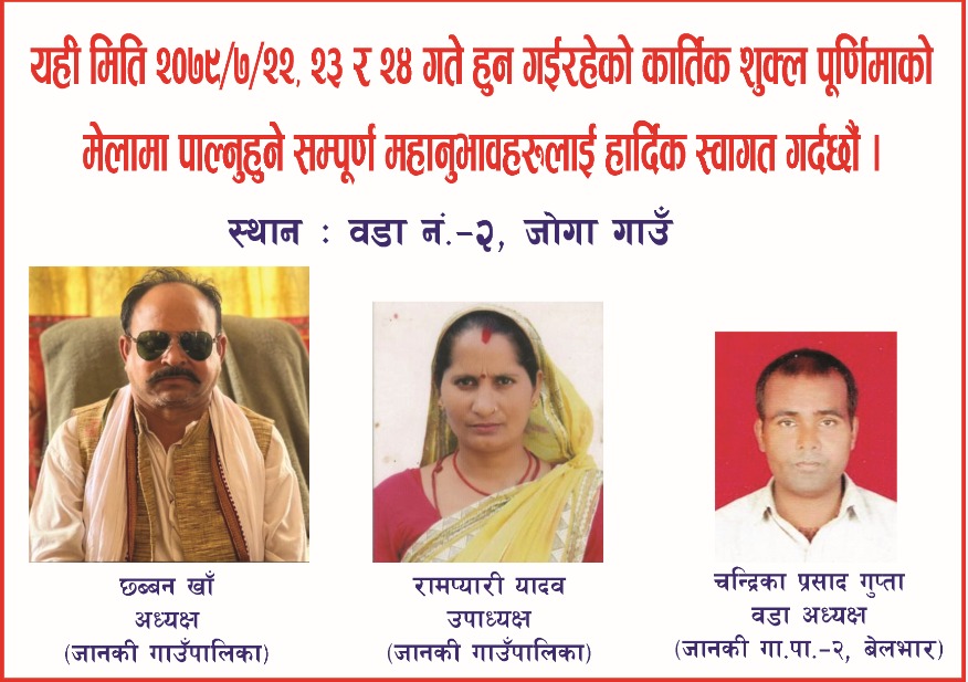 » यही मिति २०७९ कार्तिक २२,२३ र २४ गते हुन गईरहेको कार्तिक शुक्ल पुर्णिमाको मेलामा पाल्नुहुने सम्पुर्ण महानुभावहरुलाई हार्दिक स्वागत गर्दछौं.
