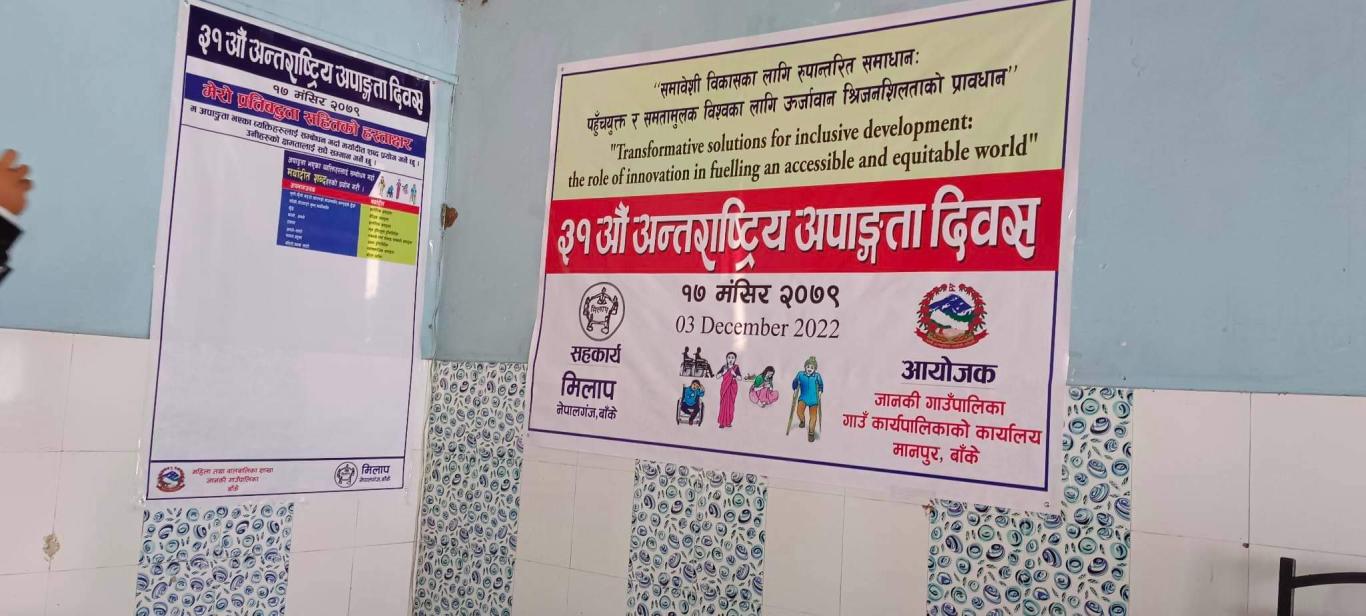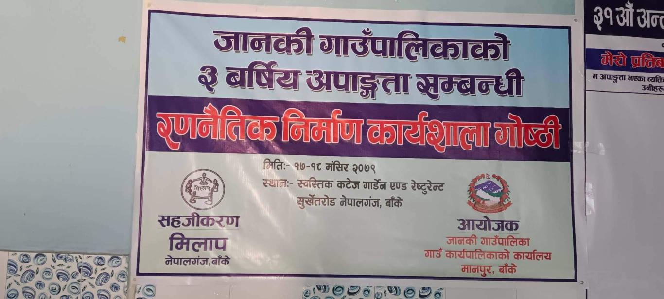 मिति २०७९ मंसिर १७ गते जानकी गाउँपालिकाको आयोजना तथा मिलाप नेपालगन्जको सहजीकरणमा जानकी गाउँपालिकाको ३ बर्षिय अपाङगता सम्बन्धी २(दुई) दिने रणनैतिक निर्माण कार्यशाला गोष्ठीका केही तस्बिरहरु.