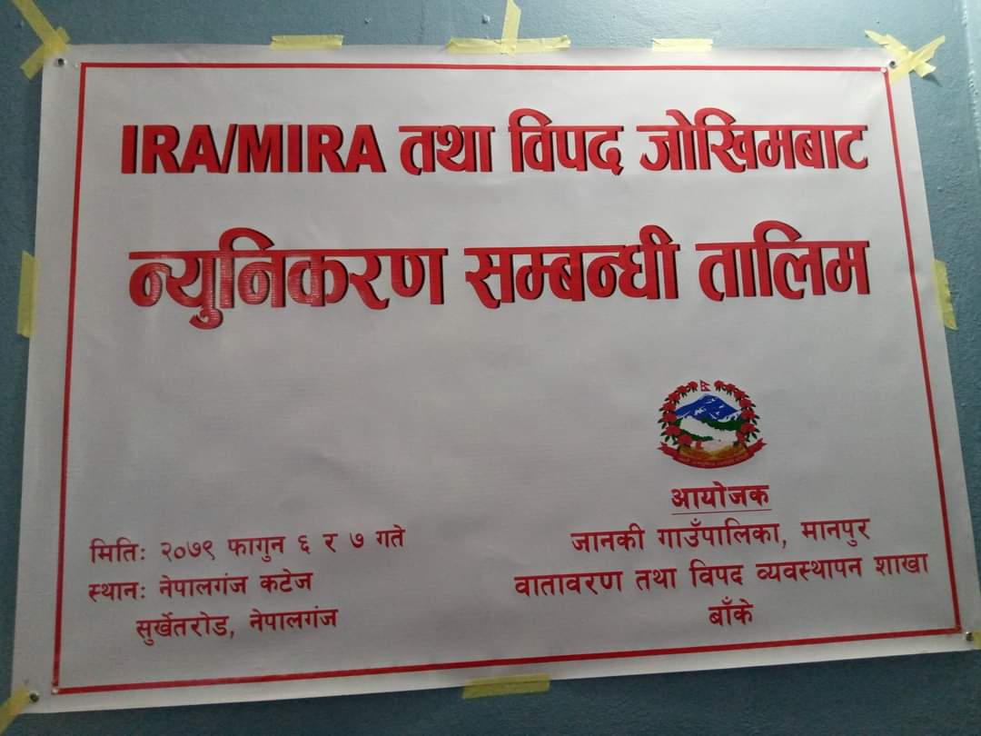 आज मिति २०७९ फागुन ६ गते जानकी गा.पा.अन्तर्गत विपद व्यवस्थापन शाखाको आयोजनामा IRA/MIRA तथा विपद जोखिम न्यूनीकरण सम्बन्धि २ दिने तालिमको उद्घाटन कार्यक्रमका केही झलकहरु.