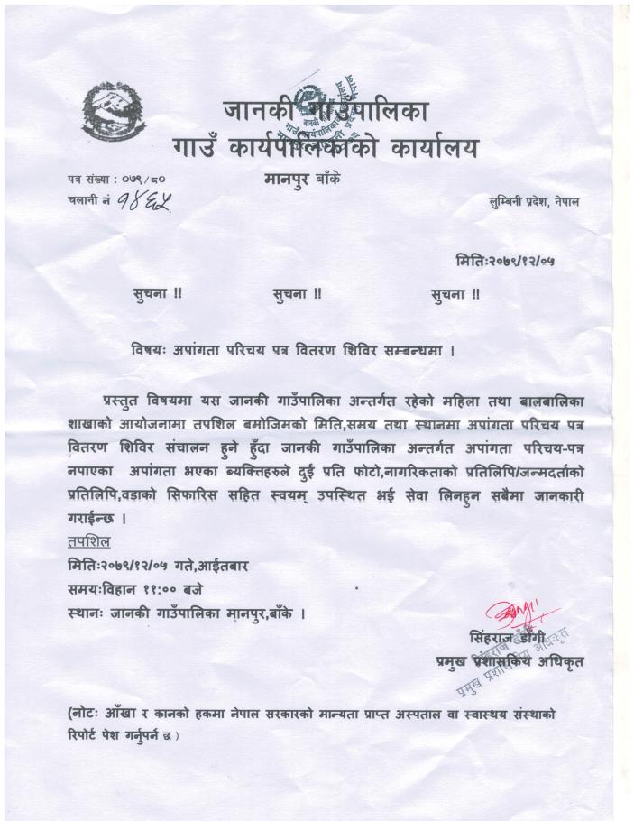 » अपांगता परिचय पत्र वितरण शिविर सम्बन्धी सूचना.