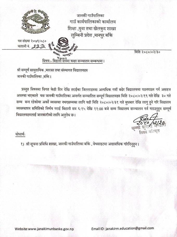 बिहानी सत्रमा कक्षा संचालन सम्बन्धमा.