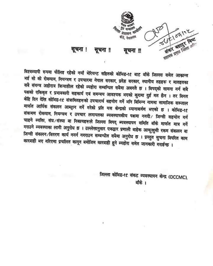 जिल्ला कोभिड १९ सकंट व्यवस्थापन केन्द्र(DCCMC) बाँकेको सुचना ।