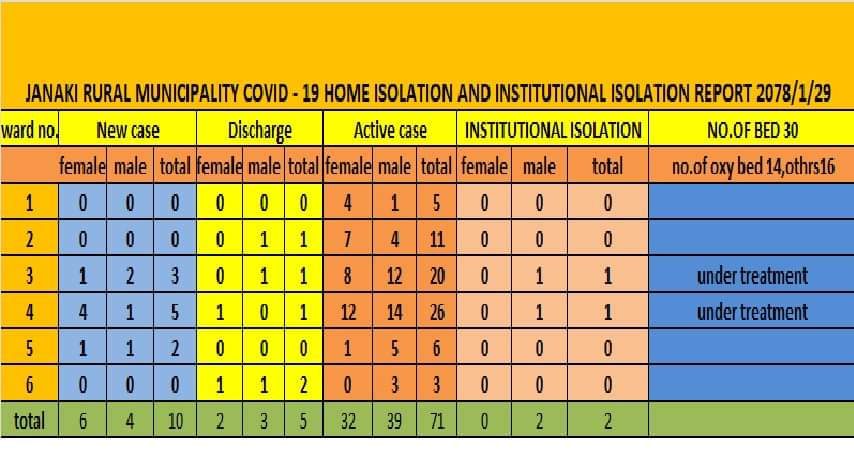 आज मिति २०७८-०१-२९ गते सम्मको जानकी गाउँपालिका अन्तर्गत वडा अनुसारको नयाँ केश,सकृय संक्रमीत तथा संस्थागत आइसोलेशनमा रहेका विरामीहरुको विवरण.