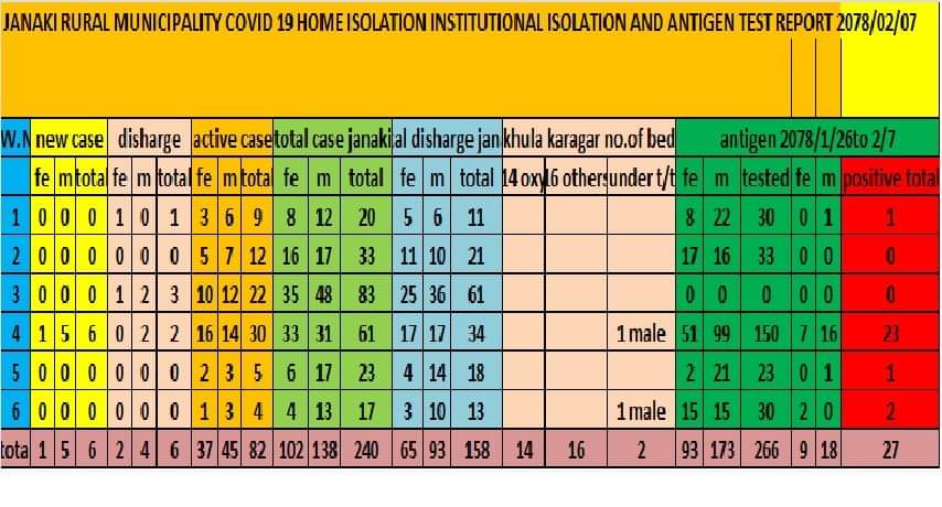 आज मिति २०७८-०२-०७ गते सम्मको जानकी गाउँपालिका अन्तर्गत वडा अनुसारको नयाँ केश,एनटिजेन परिक्षणको रिपोर्ट,सकृय संक्रमीत तथा संस्थागत आइसोलेशनमा रहेका विरामीहरुको विवरण.