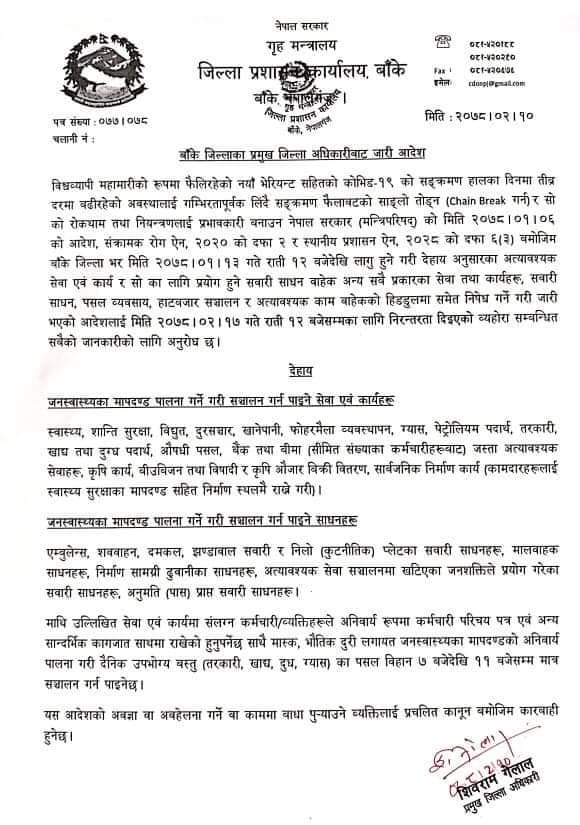 बाँके जिल्लामा जारी निशेधाज्ञा २०७८ जेष्ठ १७ गते राती १२ बजे सम्मका लागि थप गरिएको सूचना.