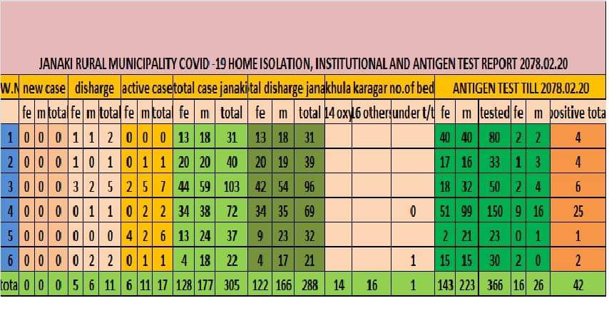 आज मिति २०७८-०२-२० गते सम्मको जानकी गाउँपालिका अन्तर्गत वडा अनुसारको नयाँ केश,एनटिजेन परिक्षणको रिपोर्ट,सकृय संक्रमीत तथा संस्थागत आइसोलेशनमा रहेका विरामीहरुको विवरण.