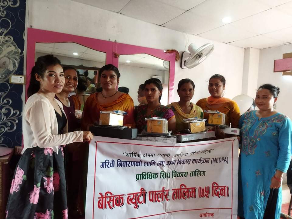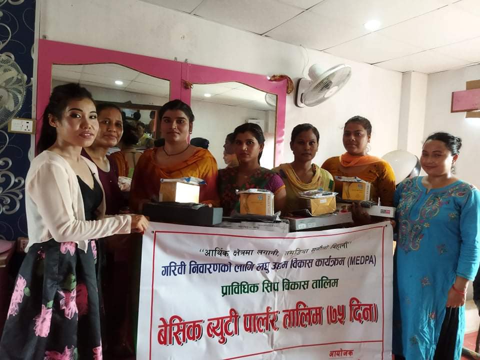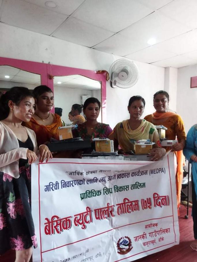 आज मिति २०७७/०३/१७ गते जानकी गाउँपालिका अन्तर्गत गरिबी निवारणको लागि लघु उद्यम विकास कार्यक्रम(MEDPA) अन्तर्गत जानकी गा.पा.बाँकेको आयोजनामा ७५ दिने बेसिक ब्युटी पार्लर तालिम समापन तथा प्रविधि सामान आईरन वितरणका केही झलकहरु.