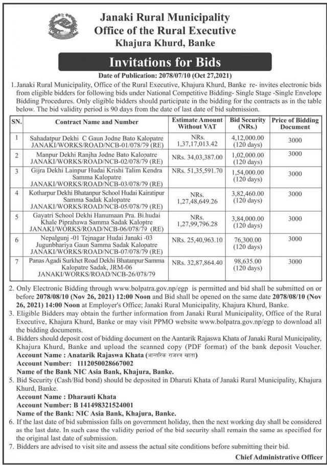 मिति २०७८-०७-१० गते नयाँ पत्रिका राष्ट्रिय दैनिकमा प्रकाशित बोलपत्र आह्वानको सूचना.