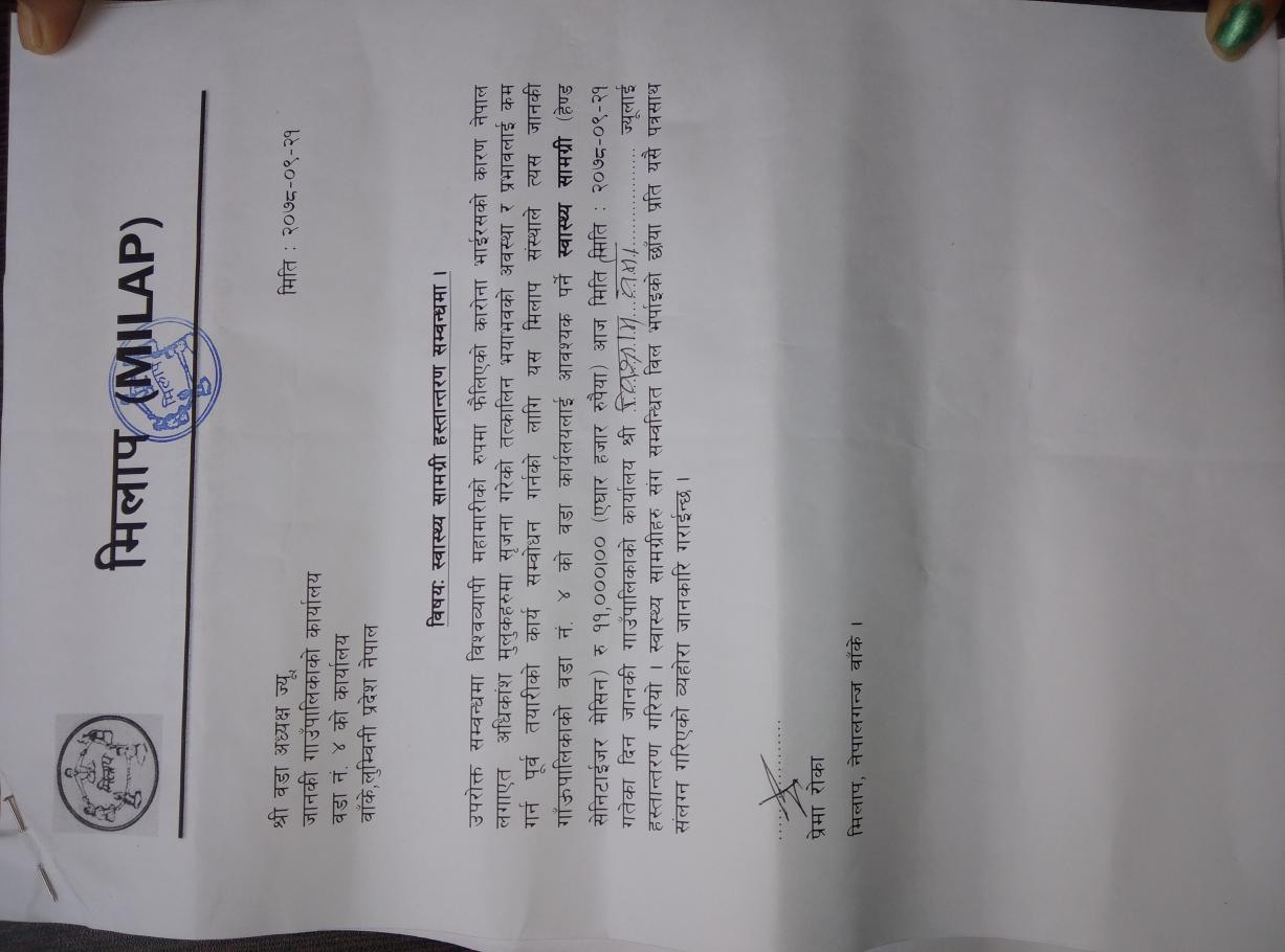 आज मिति २०७८ पुष २१ गते जानकी गा.पा.अन्तर्गत वडा नं. ४ खजुरा खुर्दलाई मिलाप(MILAP) संस्थाको आर्थिक सहयोगमा कोभिड-१९ को पुर्व तयारीको लागि स्वास्थ्य सामाग्री(हेन्ड सेनिटाईजर मेसिन) हस्तान्तरण गरिएको केही झलकहरु.