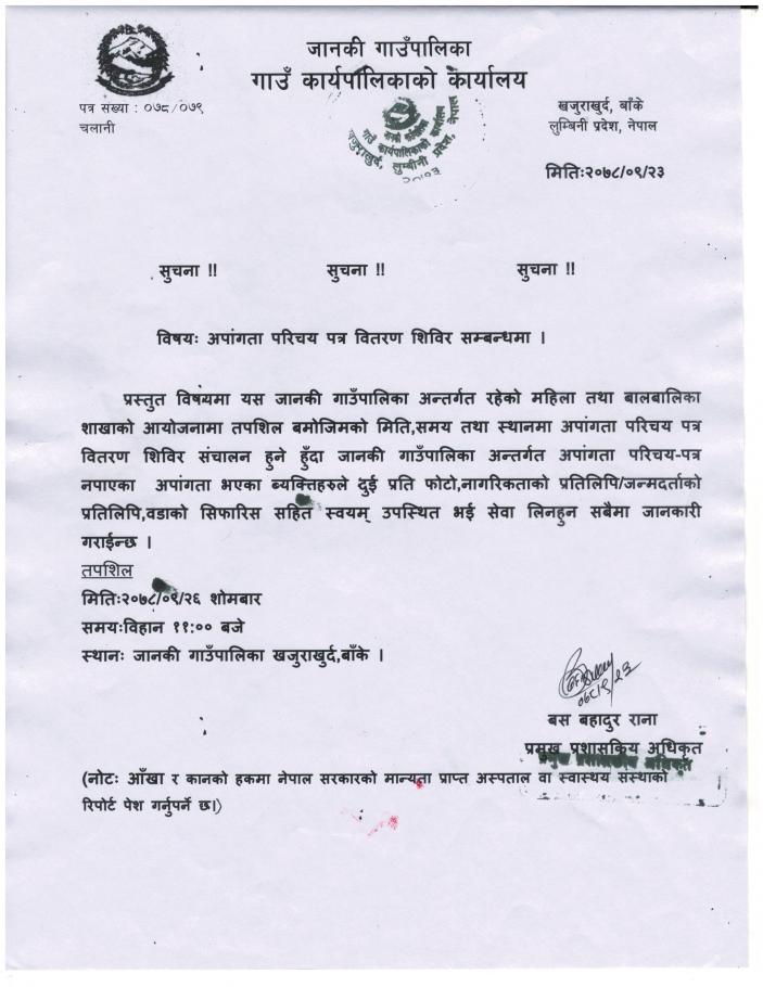 अपाङ्गता परिचय पत्र वितरण शिविर सम्बन्धी सूचना.